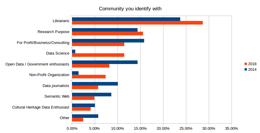 Librarians and researchers remain the two largest user group with 28.69% and 15.57% of the respondents (which is consistent with the 2014 results). We can notice the Data Science, and Non-Profit organization groups increased since 2014.