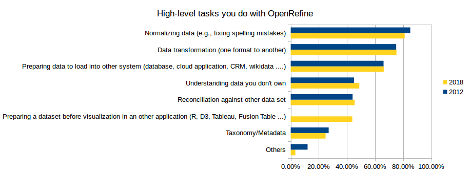 Usage breakdown remains stable compared to the 2012 survey. 87.77% of the respondents are using OpenRefine to address more than one type of task.